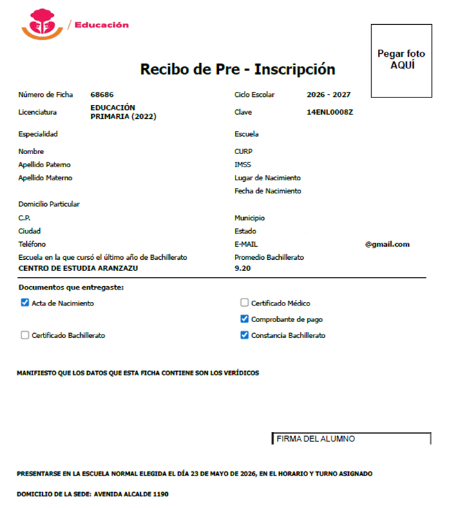 - Recibo de Pre-Inscripción (hoja de ratificación): Debes tener el documento que recibiste de la Escuela Normal a la que aspiras. Pégale una fotografía tamaño infantil (blanco y negro o color) y plasma tu firma.