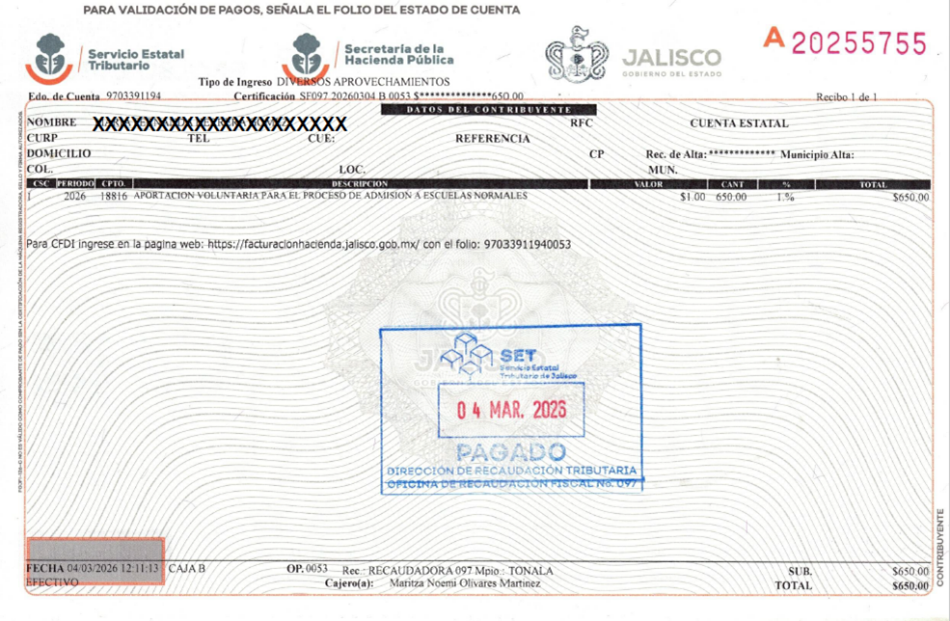 • Comprobante de pago realizado ante la Recaudadora Estatal. Para ello, deberá presentar la orden de pago que puede descargar en el botón con el mismo nombre. El pago se realiza bajo el concepto 18816 (Aportación voluntaria para el proceso de admisión a Escuelas Normales) por un monto de $650.00 (seiscientos cincuenta pesos 00/100 M.N.), como aportación destinada al desarrollo académico y tecnológico de la institución. El pago referido no constituye contraprestación por la admisión ni garantiza el ingreso a la institución, ya que el proceso de selección se determina exclusivamente conforme a los criterios establecidos en la presente convocatoria.