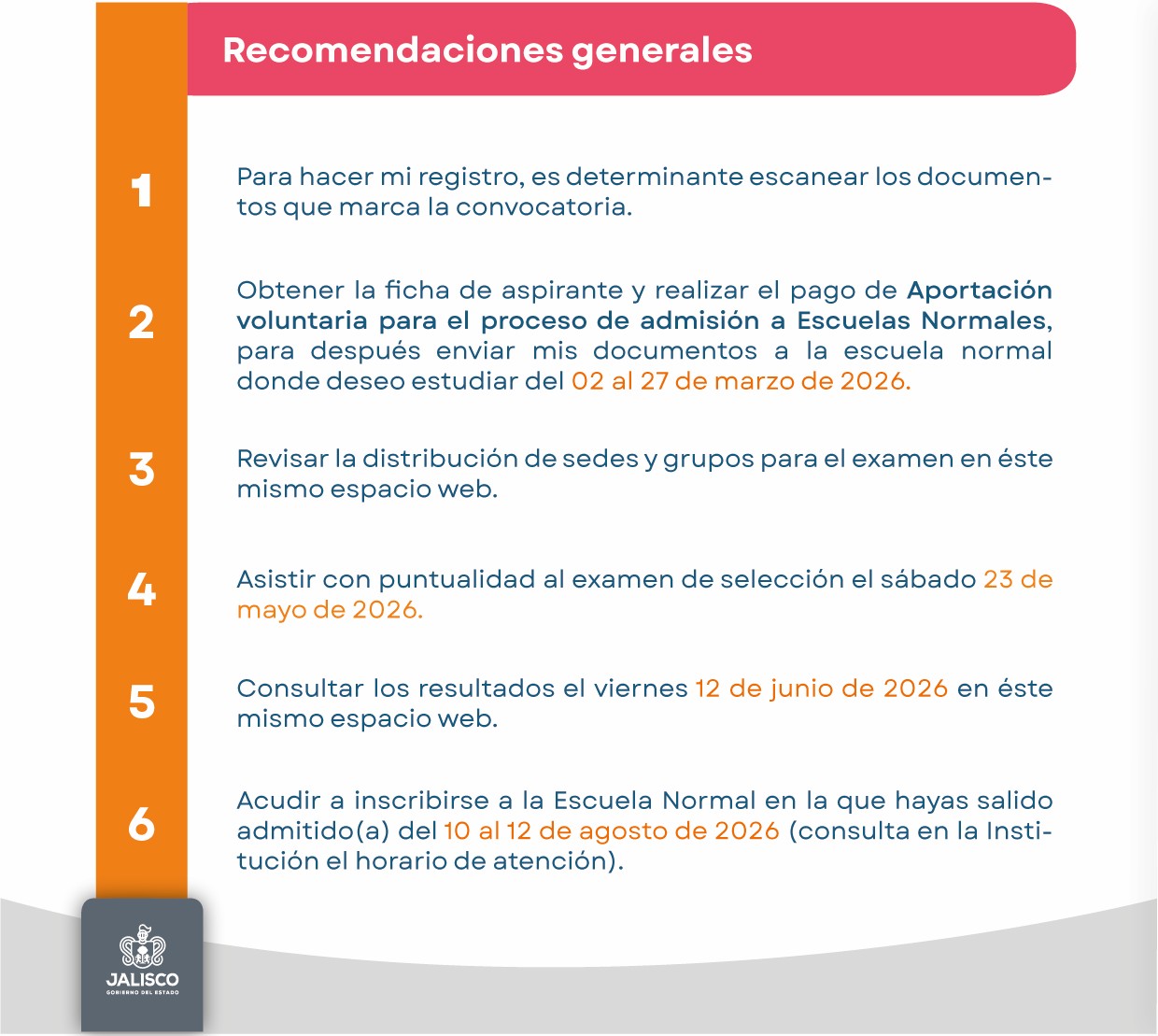 TERCERA. DEL PROCESO DE REGISTRO. El proceso deberá realizarse del 2 al 27 de marzo de 2026, en la plataforma oficial: https://apprende.jalisco.gob.mx/direccion-educacion-normal/zona-del-aspirante/. En dicho portal, los interesados encontrarán una sección denominada “Recursos”, la cual contiene los botones organizados secuencialmente para completar cada etapa del trámite.