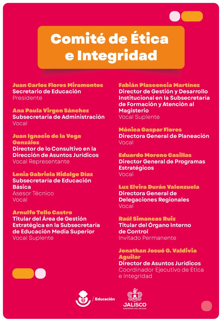 Comité de Ética, Conducta y Prevención de Conflictos de Interés El Comité de Ética, Conducta y Prevención de Conflictos de Interés de esta Secretaría de Educación pone a su disposición el siguiente correo para recibir denuncias: comitedeetica.sej@jalisco.gob.mx Anexo, identificación de riesgos éticos Aviso Comité de Ética Código de conducta SEJ Decálogo Servidor Público SEJ Presentación Denuncias Comité de ética Riesgos éticos SEJ Identificación de riesgos éticos y definición de pautas de conducta específicas para prevenirlos Protoclo cero Impresos PC curvas Cartel protocolo cero Cartel 2 protocolo cero Stickers protocolo cero Tabloide protoclo cero Acosómetro Violentómetro Acta de Conformación del Comité de Ética e Integridad Acuerdo Lineamientos Generales de Integración y Funcionamiento de los Comités de Ética e Integridad Código de Ética e Integridad 2025 Presentación de Ética e Integridad